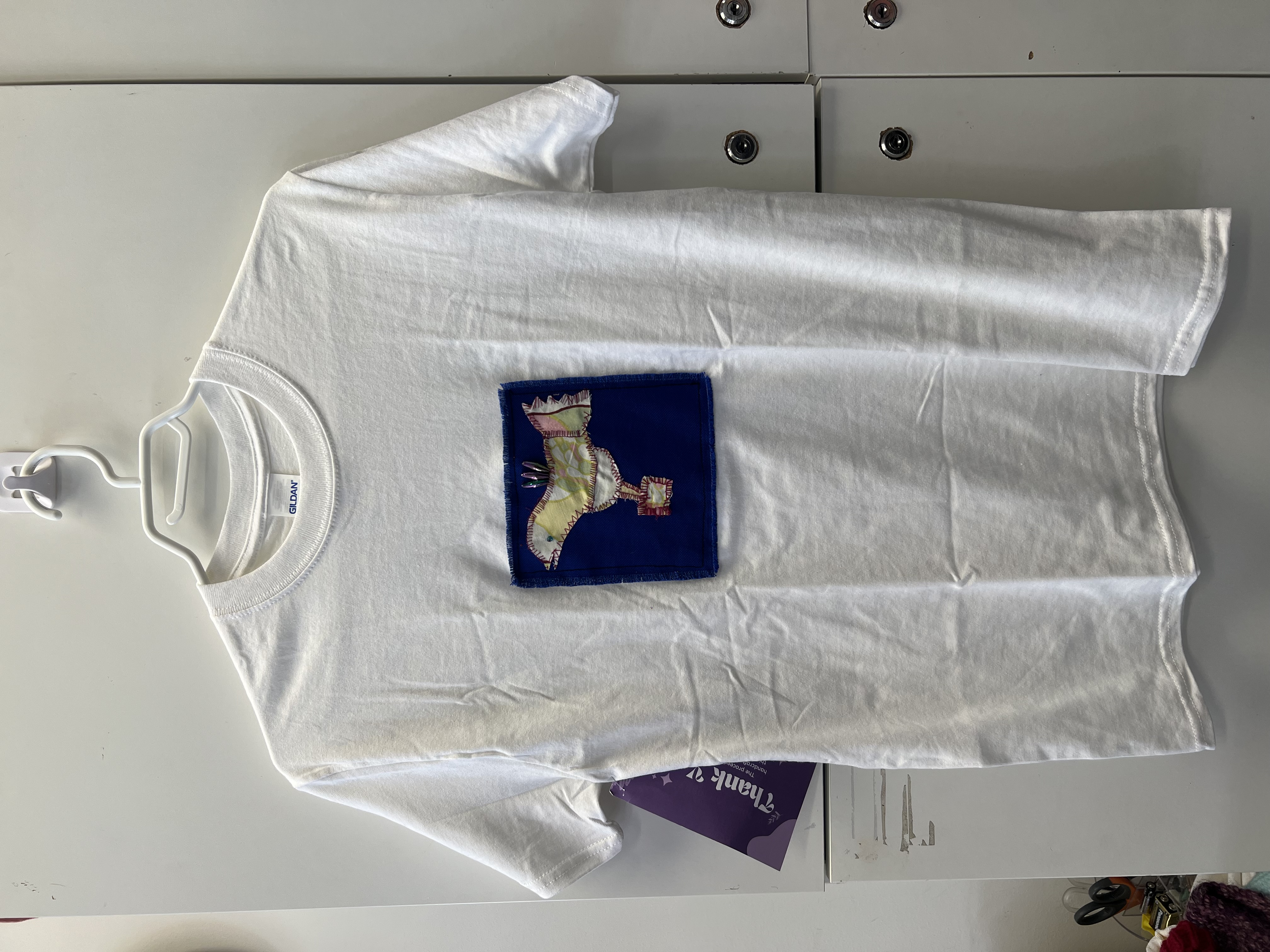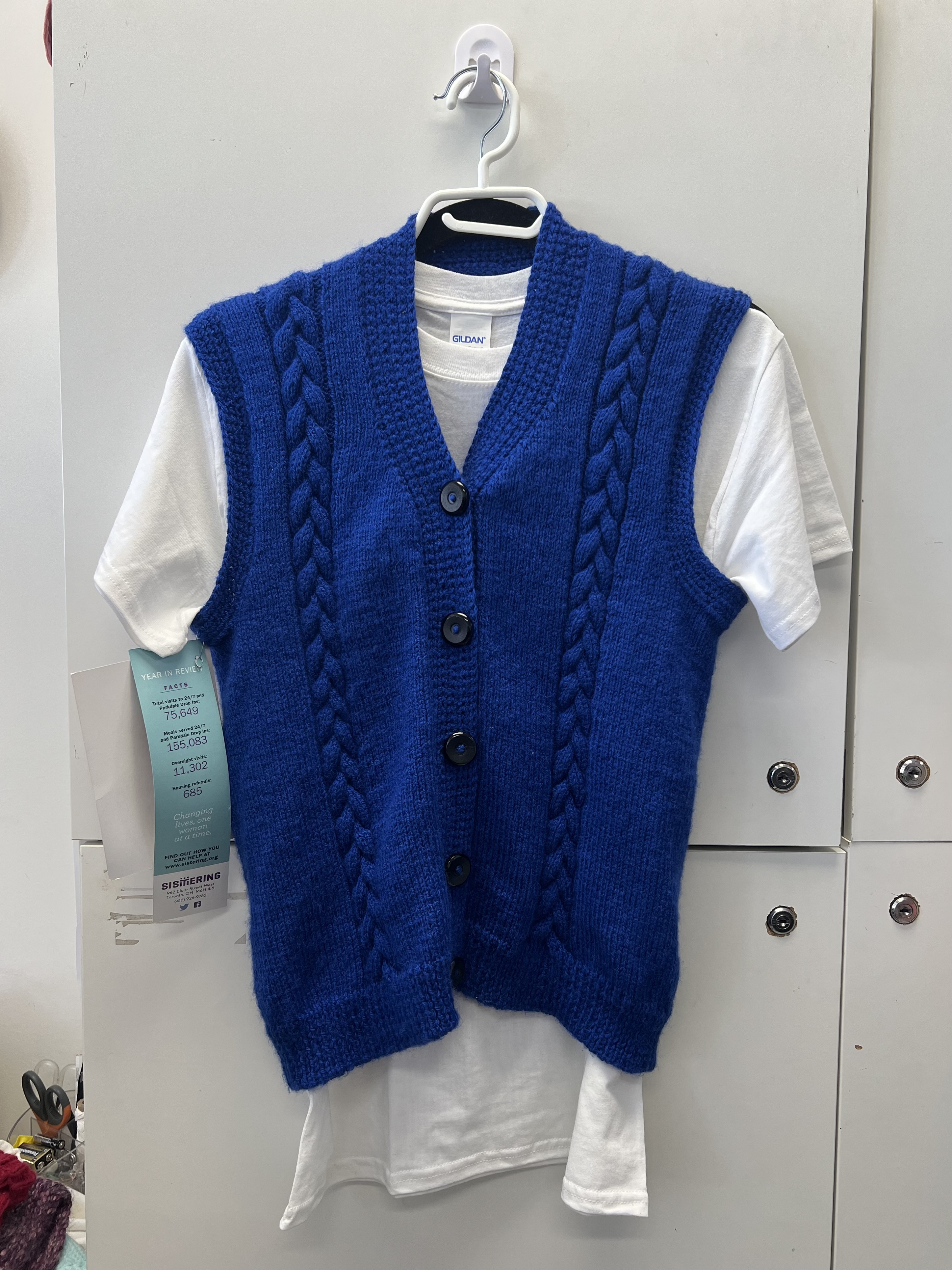 Upcycled white t-shirt with embroidered patchwork design. Hand-knit blue vest with black buttons. Items available separately (T-shirt - $35, Vest - $70). Size medium.
