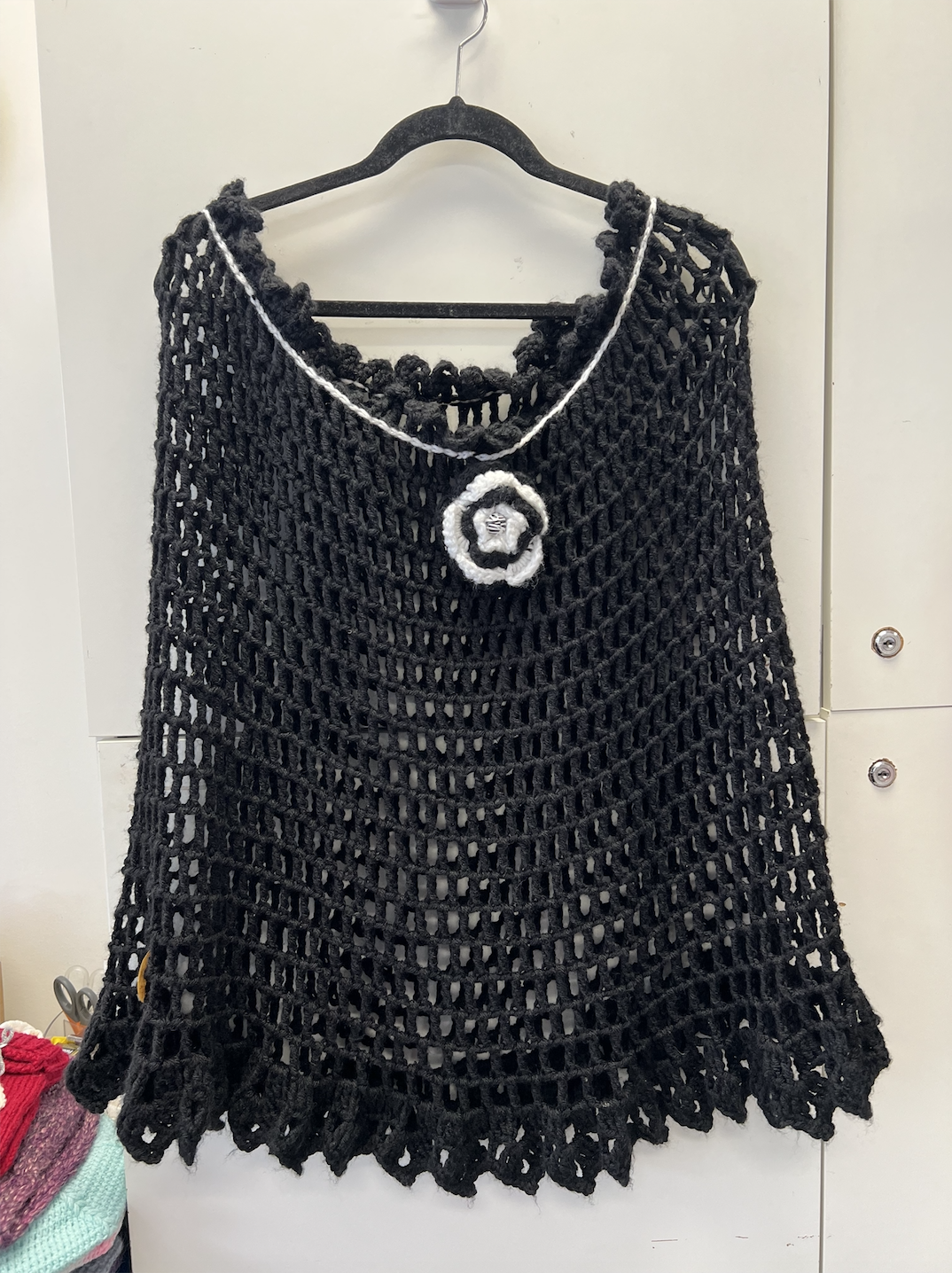 Black open stitched hand-crocheted poncho with white flower detail. Size large.