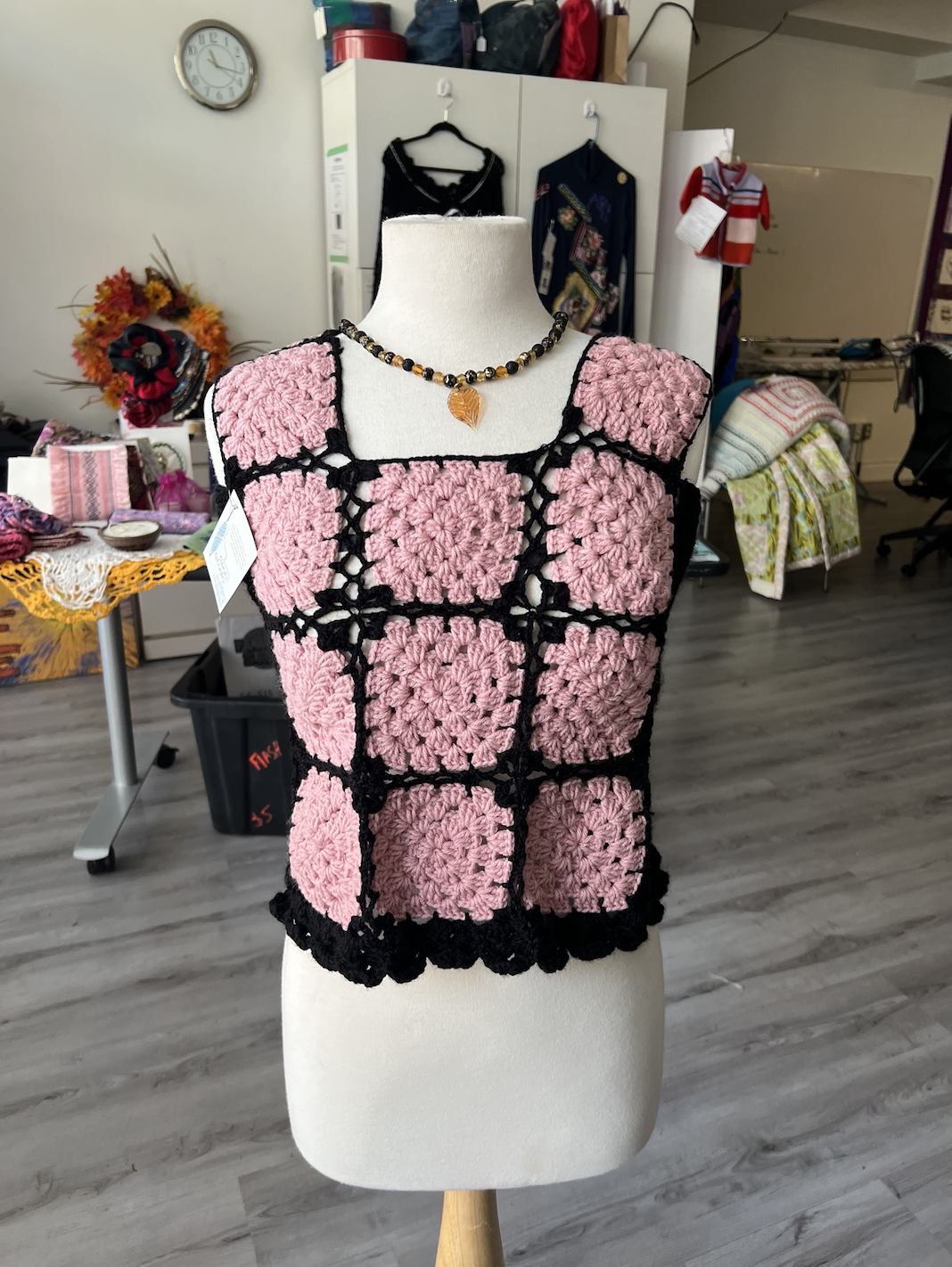 Hand-crocheted pink top with black detailing. Size small/medium.